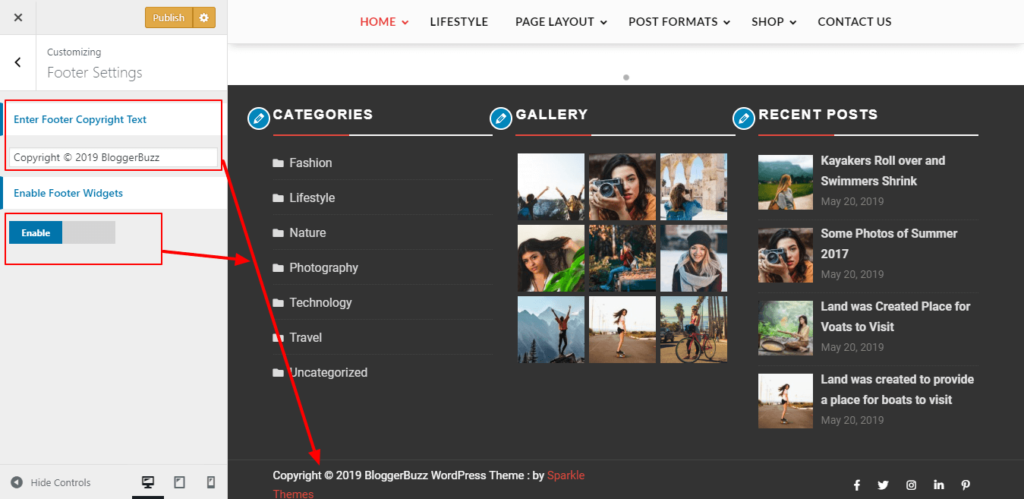 - Go to Dashboard > Appearance > Customize > Footer Settings.