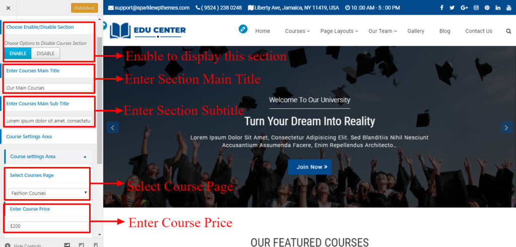 - Enter Courses Section Main Title and Subtitle in their Respective Areas.