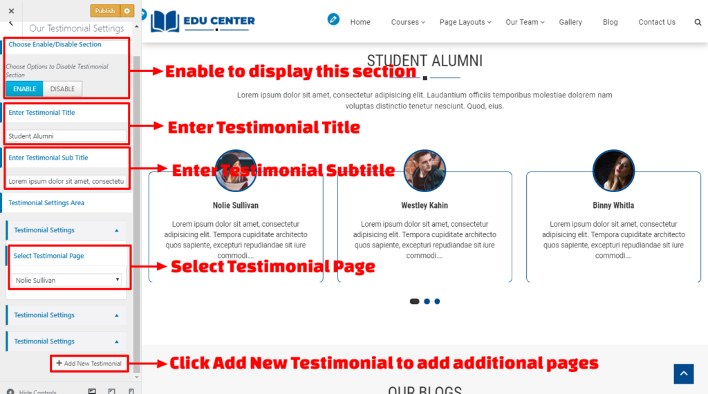 - Click on Add New Testimonial to Add Additional Pages in this Section.