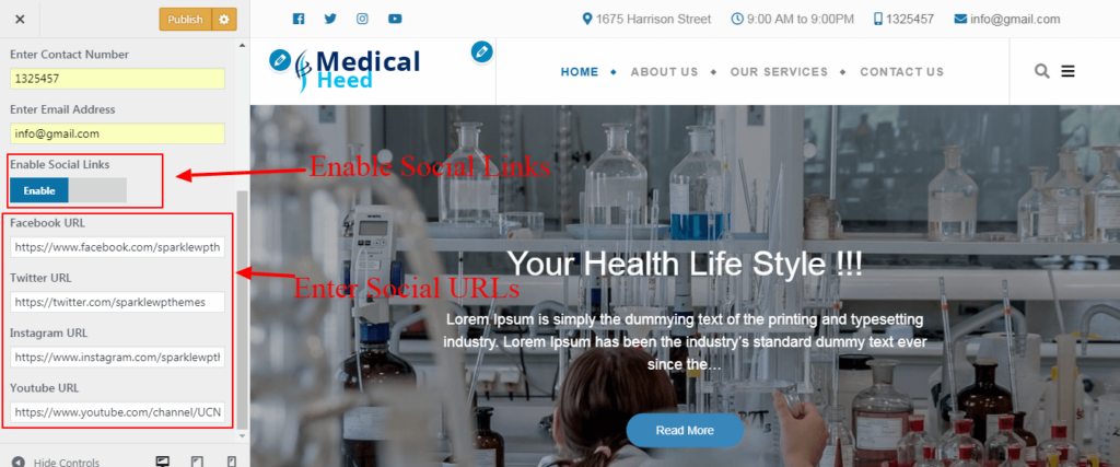 - Top Header General Settings > Quick Contact Information(to add/change e-mail, phone no., add & opening time)